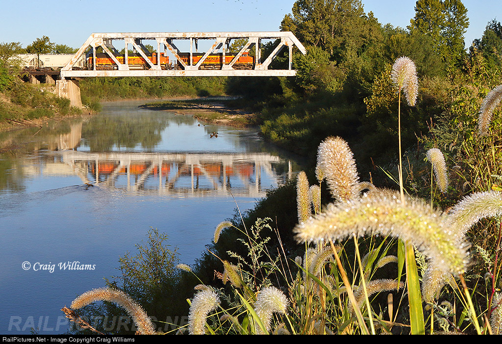 | I was working on getting some shots off the track on the Marceline Sub over the weekend. One area I hit was the Chariton River bottoms west of Elmer. As the sun works thru the trees and eastbound empty sand train blast over the river. I was amazed how much dew was on these weeds that is along the river. Not big into the thru truss bridges, but something different in the beautiful morning sun. That was what I was looking for as the endless parade of GE's work this Transcon Mainline. |
