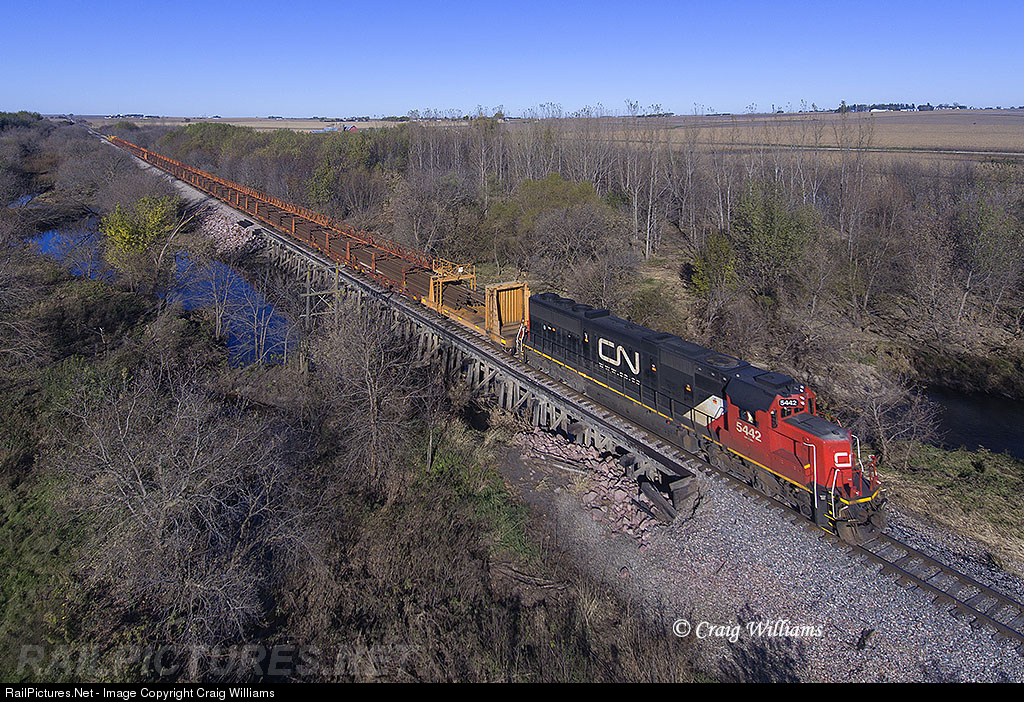 | The CN continues to get rail in place In Iowa as fall approaches.The CN has over 57 miles of replacement steel they like to get in before winter sets in. This rail train is heading to the Cedar Rapids Sub to dump rail. Here they cross Prairie Creek just outside of Masonville on the Dubuque Sub. The train will head south at Manchester in 6 miles towards Cedar Rapids. |