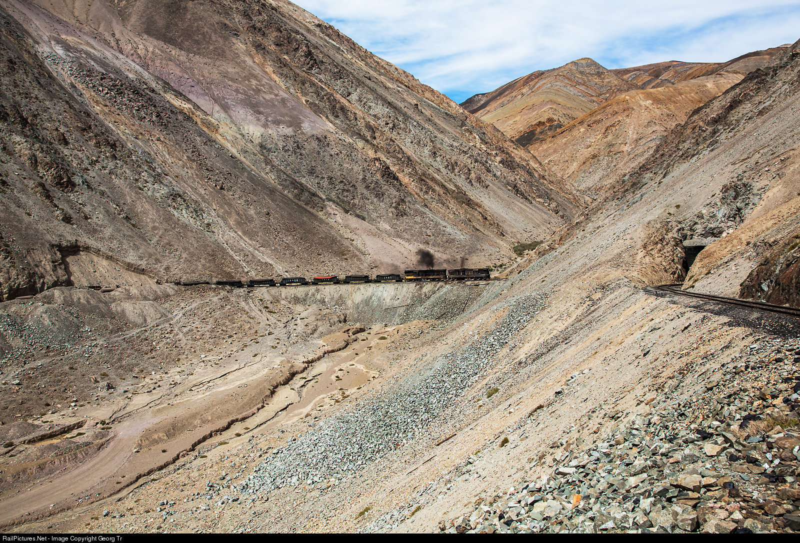 Very sad, one of the most spectacular railroads worldwide, the 1 meter gauge line Chañaral - Llanta - Potrerillos, is shut down since march 2015, largely destroyed between Llanta and Chañaral by floods. If you search for the route on Google Earth today, you will only find sad remains, large sections have been buried, washed away, built over by new roads, and so on. The very durty GR12 # 93 and # 412 of Ferronor are pulling 7 loaded hoppers with copper concentrate from the loading site above Llanta and 4 empty sulphuric acid tank cars from the unloading track in Llanta up to the smelter in Potrerillos in 2012.