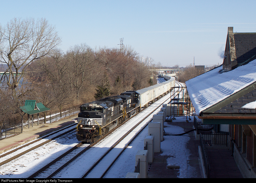 NS 1023 leads NS 255 south as it passes the Amtrak station in Lafayette, Indiana