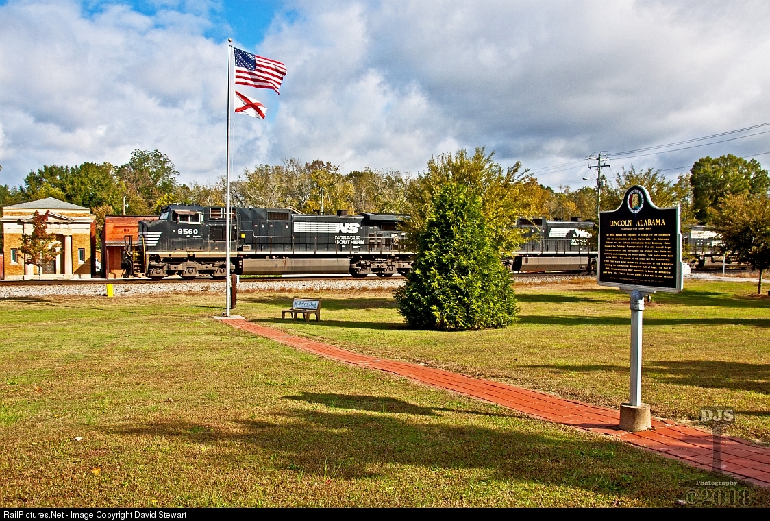 NS 23D slides through downtown Lincoln, Alabama along the East End District on October 26, 2018. A historical marker lists Lincoln with accomplishments through the 1960's, 70's and 80's which include Logan Martin Lake, Interstate 20 and the Alabama International Motor Speedway.
