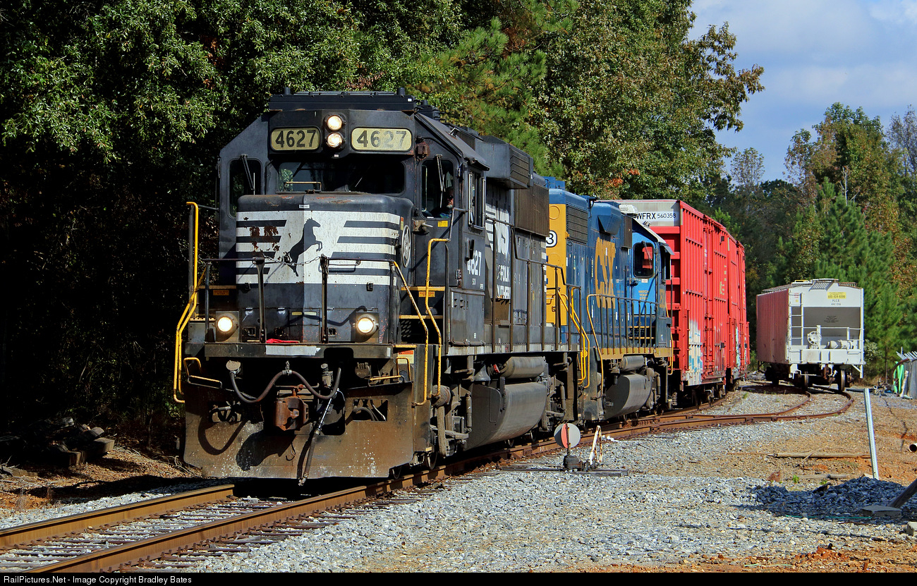 Right place, right time. A job that I have been wanting to Photograph for years finally happened on October 31st, 2018. CSX Job A736 heads back to the Coosa Pines Paper Mill (AKA Kimberly Clark) which is just a couple of miles ahead just north of downtown Childersburg, AL. They are seen at Indian Hill, AL. With NS GP59 #4627 leading CSXT GP38-2 #2523. This line cuts off from NS's Anniston District in downtown Childersburg & runs north to Grasmere where it joins into CSX's Lineville Sub. From my understanding, both NS & CSX have joint ownership of this branch line, which is the reason they use both NS & CSX Locomotives together.