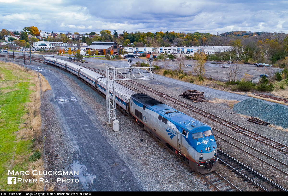 Amtrak 256 passes the NYC searchlights at 114 on the afternoon of Sunday, October 28, 2018 in Hudson, NY. While there have been substantial reductions in the amount of these signals in recent years in other places, the upper Hudson Line still hosts a variety of these relics.