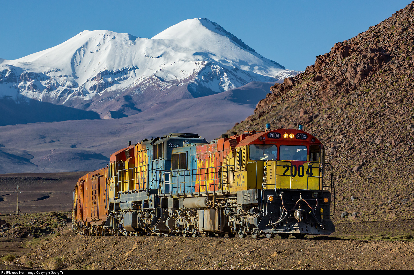Touching the sky! The FCAB line to Bolivia is reaching nearly 4000 meter on the Ascotan pass summit, here we are on about 3450 m. Untypical precipitations in december 2011 caused more snow then usual on the volcanos. Former Queensland Railway GL26C-2 # 2004 and former Columbia (FNC) GT22CU-3 (rebuilt GR12) # 2404 are pulling a boxcar train from Bolivia to Antofagasta south of the Ascotan pass, with about 5900 meter high mountains in the background.