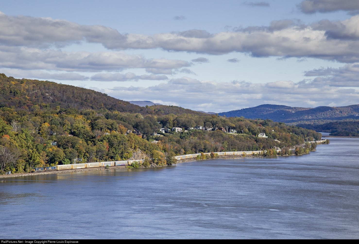 | On an autumn morning in Hudson valley, a southbound autorack CSX train is snaking along the Hudson River west shore, through CP43 at Fort Montgomery NY. |