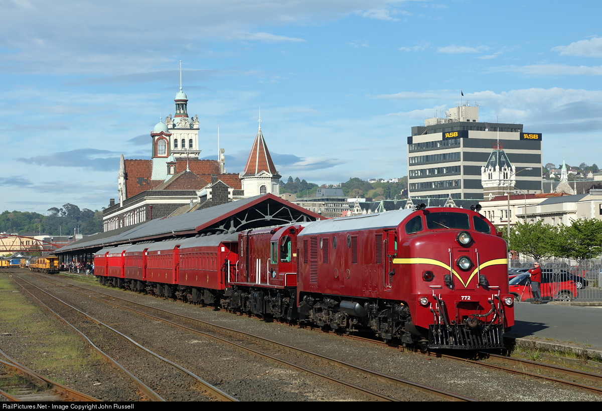 | Now for something a little fancy... English Electric built DG 772 and DI 1102 locomotives restored by Diesel Traction Group head a special run by Steam Incorporated at the magnificent Dunedin station. Two Dunedin Railways DJ locomotives were added before departure for Christchurch due to a fire suppression equipment requirement in tunnels. |