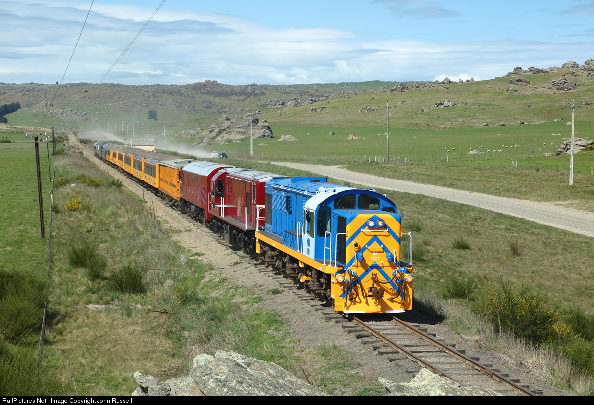 | Dunedin Railways DJ 1221 leads DTG restored DI 1102 and DG 772 on a Taieri Gorge train to Middlemarch. The Otago Central closed beyond Middlemarch in 1990 and is now a famous cycle trail that includes several viaducts and tunnels. The DJ class were built by Mitsubishi in Japan and entered service in 1968. |