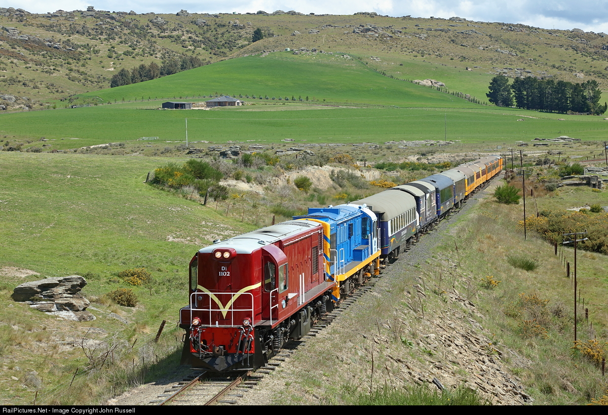 Newly restored 1102 leads DJ 1221 on a special from Middlemarch to Pukerangi. The Otago Central line closed beyond Middlemarch in 1990 and is now a famous cycle trail that includes several viaducts and tunnels. 1102 was built in Queensland and entered service in 1966. The DJ was built by Mitsubishi and entered service in 1968 and is one of several operated by Dunedin Railways.