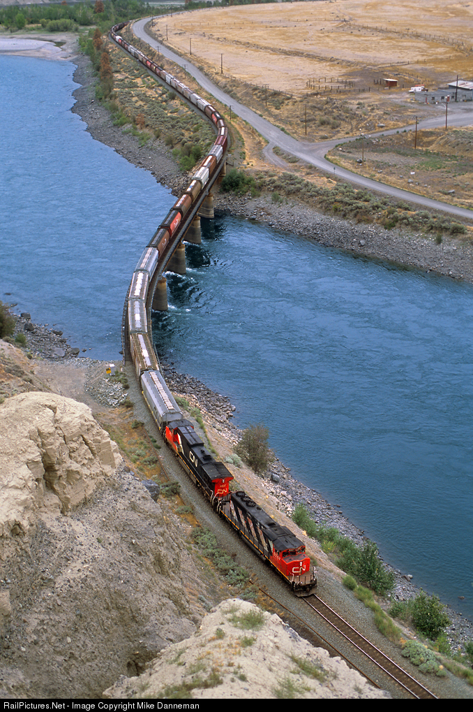 A westbound Canadian National grain train crosses the Thompson River at Ashcroft, British Columbia, on September 1, 2007. Leading the train is one of CN’s comfort cab-equipped GMD SD40-2Ws No. 5267, along with GE C44-9W No. 2627.