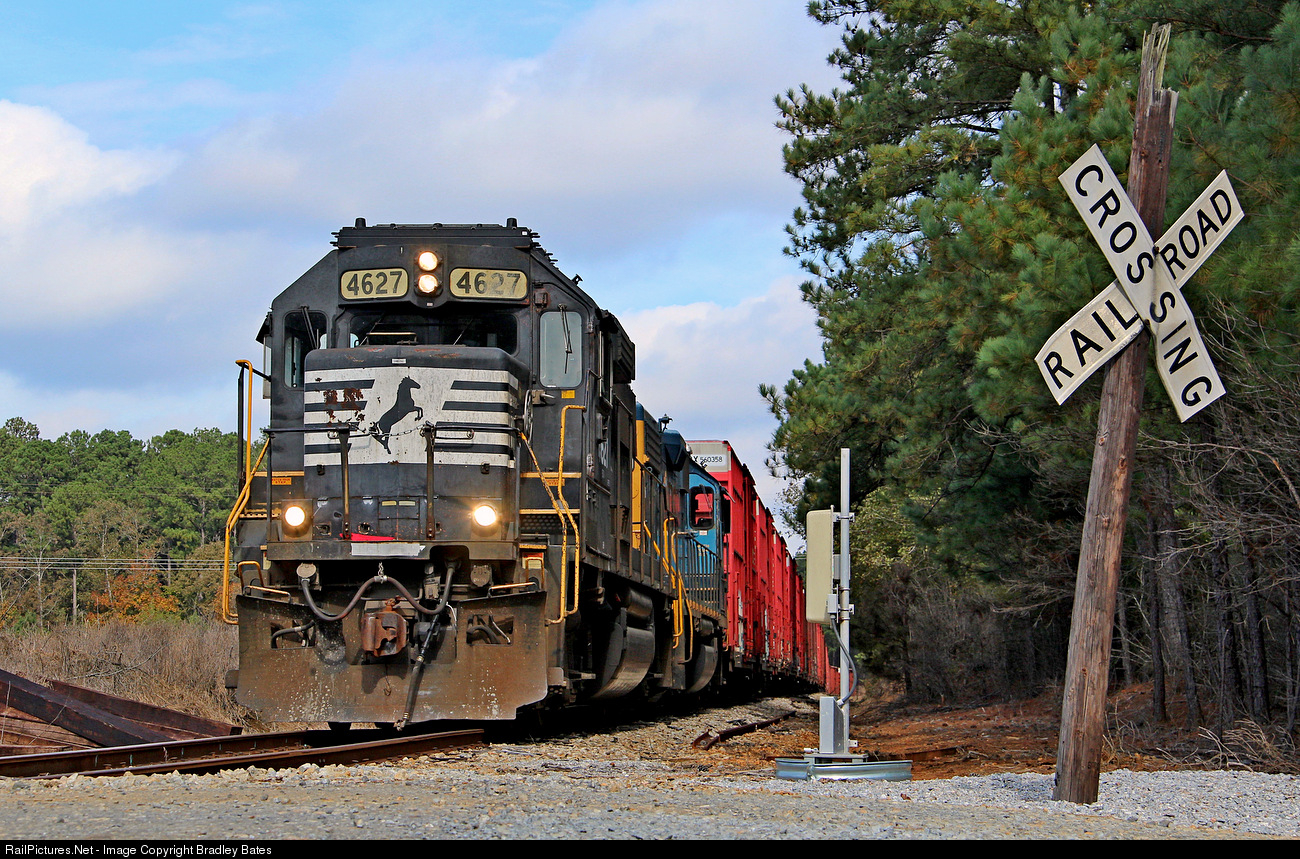 Right place, right time. A job that I have been wanting to Photograph for years finally happened on October 31st, 2018. CSX Job A736 is seen here at Grasmere, AL. After just coming off CSX's Lineville Sub with their cut of cars for the Coosa Pines Paper Mill (AKA Kimberly Clark) which is just a few miles ahead just north of downtown Childersburg, AL. NS GP59 #4627 & CSXT GP38-2 #2523 is the power for this days run. This branch line cuts off from NS's Anniston District in downtown Childersburg & runs north to Grasmere where it joins into CSX's Lineville Sub. From my understanding, both NS & CSX have joint ownership of this branch line, which is the reason they use both NS & CSX Locomotives together.