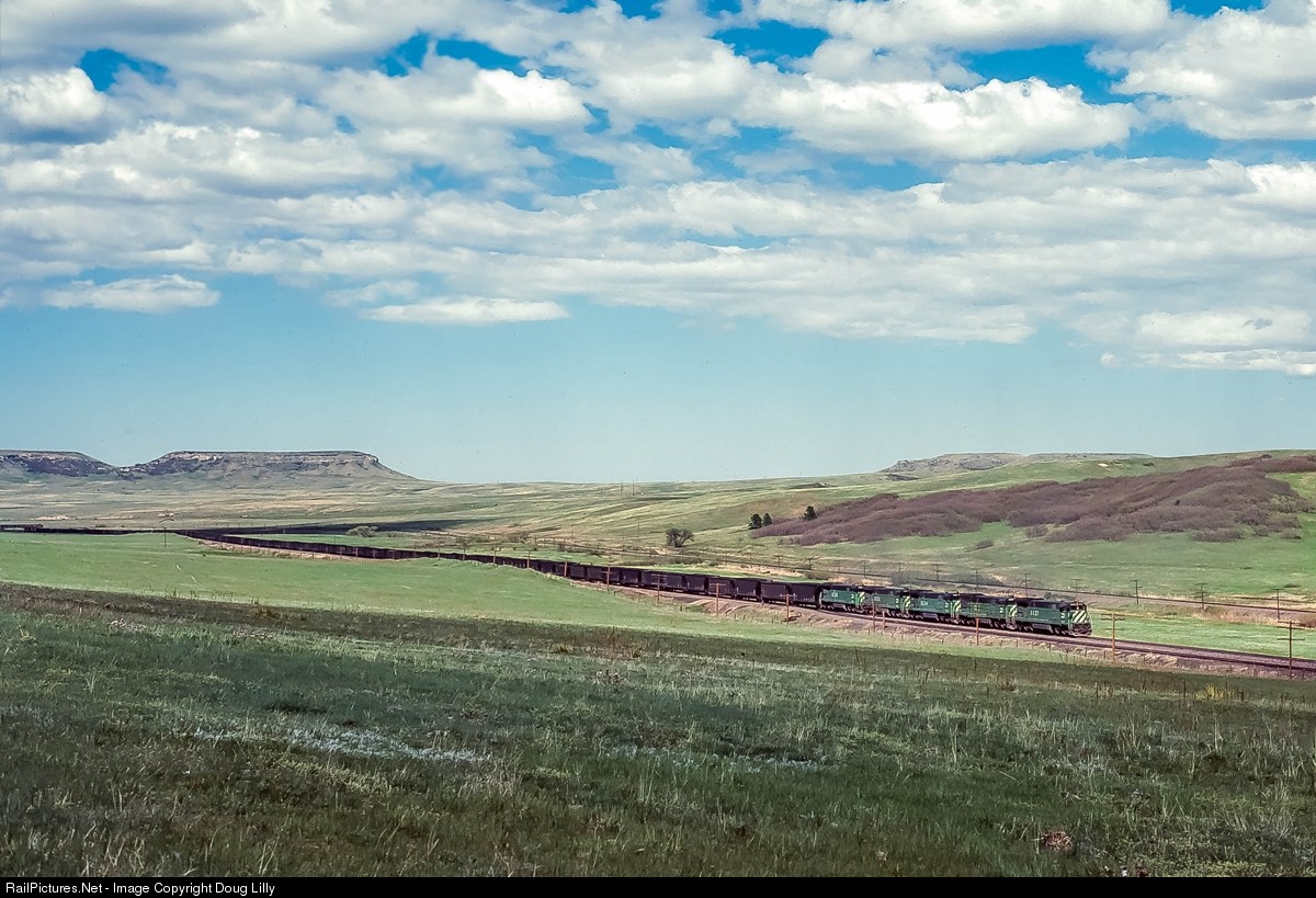 Colorado has some beautiful skies, but they can be a source of angst and frustration. Here a Burlington Northern coal train, headed south on the Joint Line at Spruce, is about to fall under a shadow cast by one of those picturesque skies.