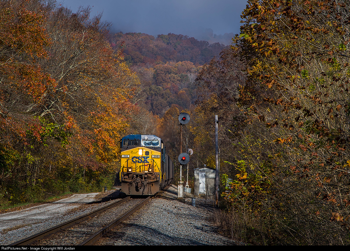 As fog burns off the tops of the mountains of Eastern Kentucky on an absolutely gorgeous fall morning, a loaded coal train makes its way across the Cumberland Valley Subdivision, passing the L&N searchlights at SE Bailey's surrounded by spectacular autumn foliage.