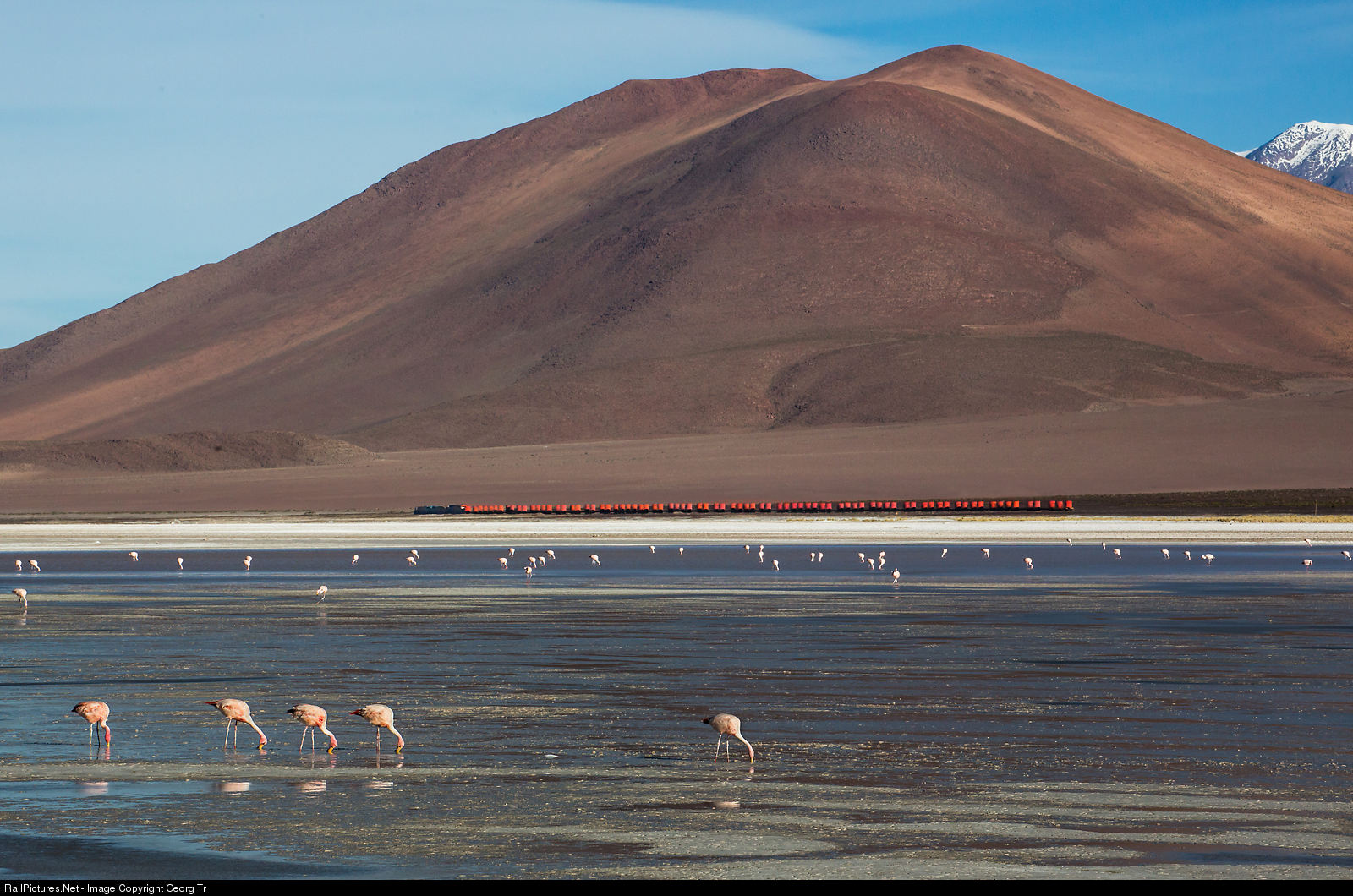 Jamesflamingos on the Salar de Ascotan on 3730 meter a.s.l. 3 locomotives of the FCAB (Ferrocarrill de Antofagasta a Bolivia) are pulling an impressive about 2300 ton train (lead/zinc/silver concentrates in containers) from the San Cristóbal mine in Bolivia towards the harbour of Mejillones north of Antofagasta, on the 1 meter gauge line along the Salar de Ascotan.