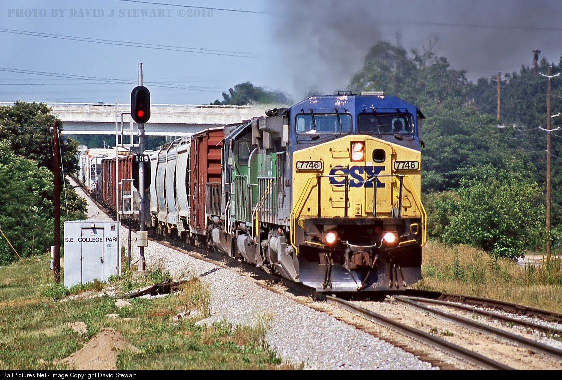 | CW40-8 7746 leads a BNSF SD40-2 and a HLCX SD40T-2 with Q619 by the XXB10.8, South End of College Park, Georgia in CSX's A&WP/WofA Subdivision. (Slide Scan) |