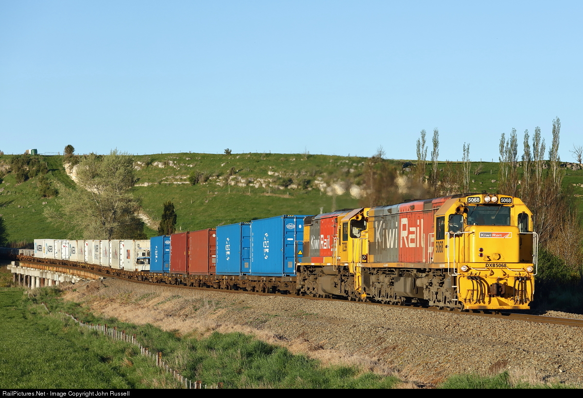 Trains on 3' 6" (1.067m) track from Whangarei to Bluff with virtually heritage rebuilt EMD and GE locomotives still the mainstay power. The network was privatized in 1990's and operated by Toll until 2008 when state owned KiwiRail was established.