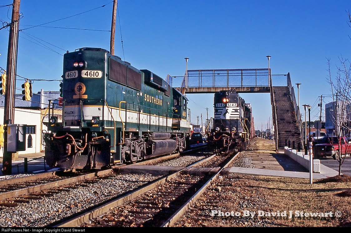 With their work for the day nearly complete, NS Local Job GE03 with 4610 slides through downtown Hapeville, Georgia engine light while headed back to Industry Yard, GE07 goes about their task, finishing their work for the Ford Plant with a GP38-2. (Slide Scan)