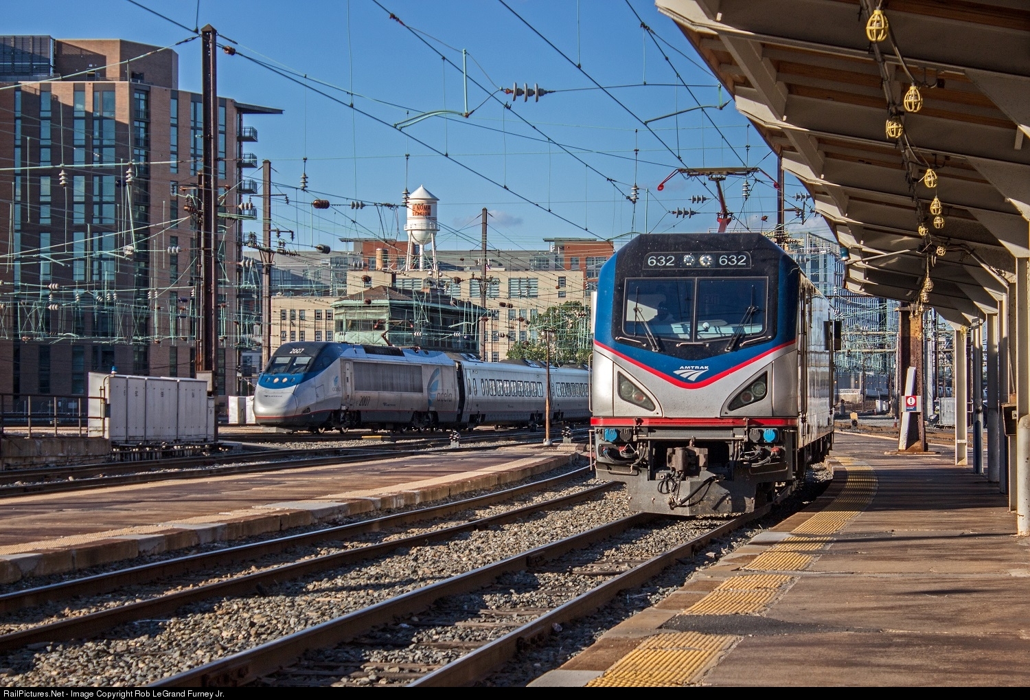 | It's a beautiful and warm Fall evening, right at rush hour. Union Station is alive with all sorts of arrivals and departures. Amtrak 80, the Carolinian, has arrived from the South, and her replacement Electric locomotive is backing down to the train while an evening Acela Express arrives on the far track. |