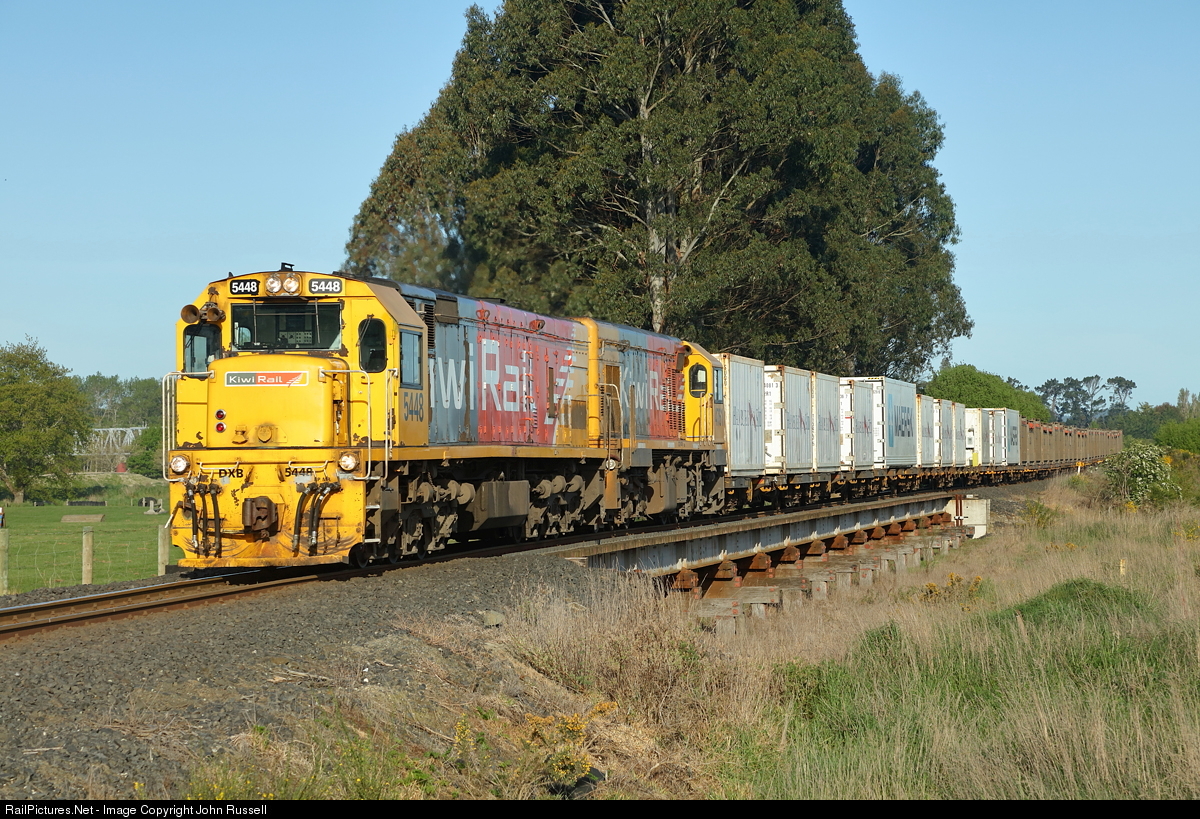 | The DX class was built by General Electric's Erie, PA plant and entered service from 1972. From 1988 the DX class received a series of modifications and, were classified DXB. Assisting is DC 4671 an EMD G12 rebuild. The train bound for Invercargill is crossing Clutha overflow with the bridge over the longest river in South Island in the distance. |