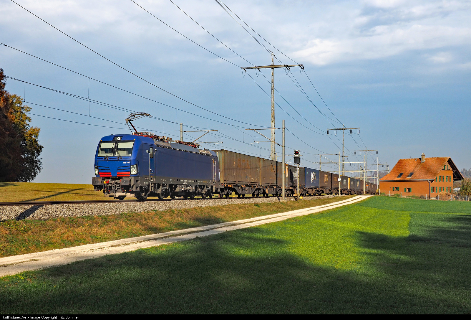 | On November 6 in 2018, when the sun is already low, the Vectron 193 491 hurries with her block train to the south. Recorded near Lyssach.