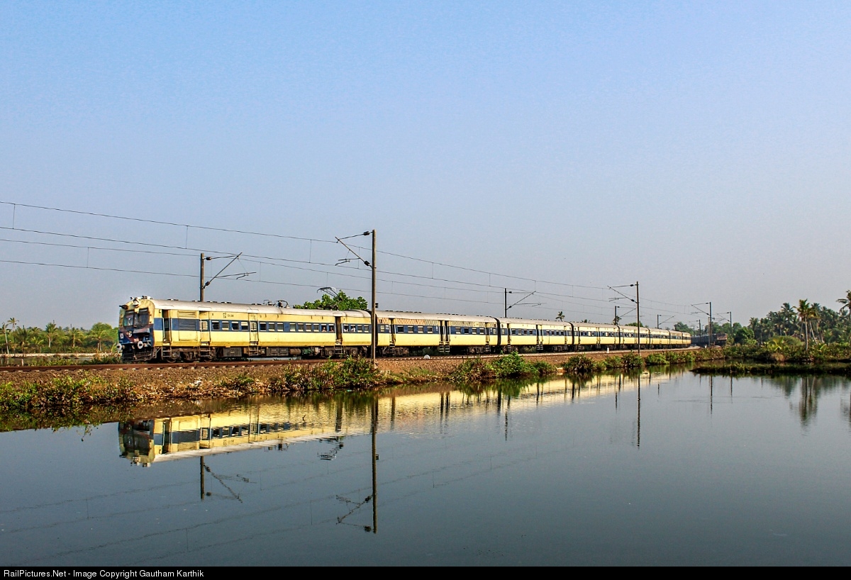 On a beautiful Sunday morning, Kollam-Ernakulam MEMU via Alappuzha approaches Munroe Island,while watching its self in the waters of the marshland. |