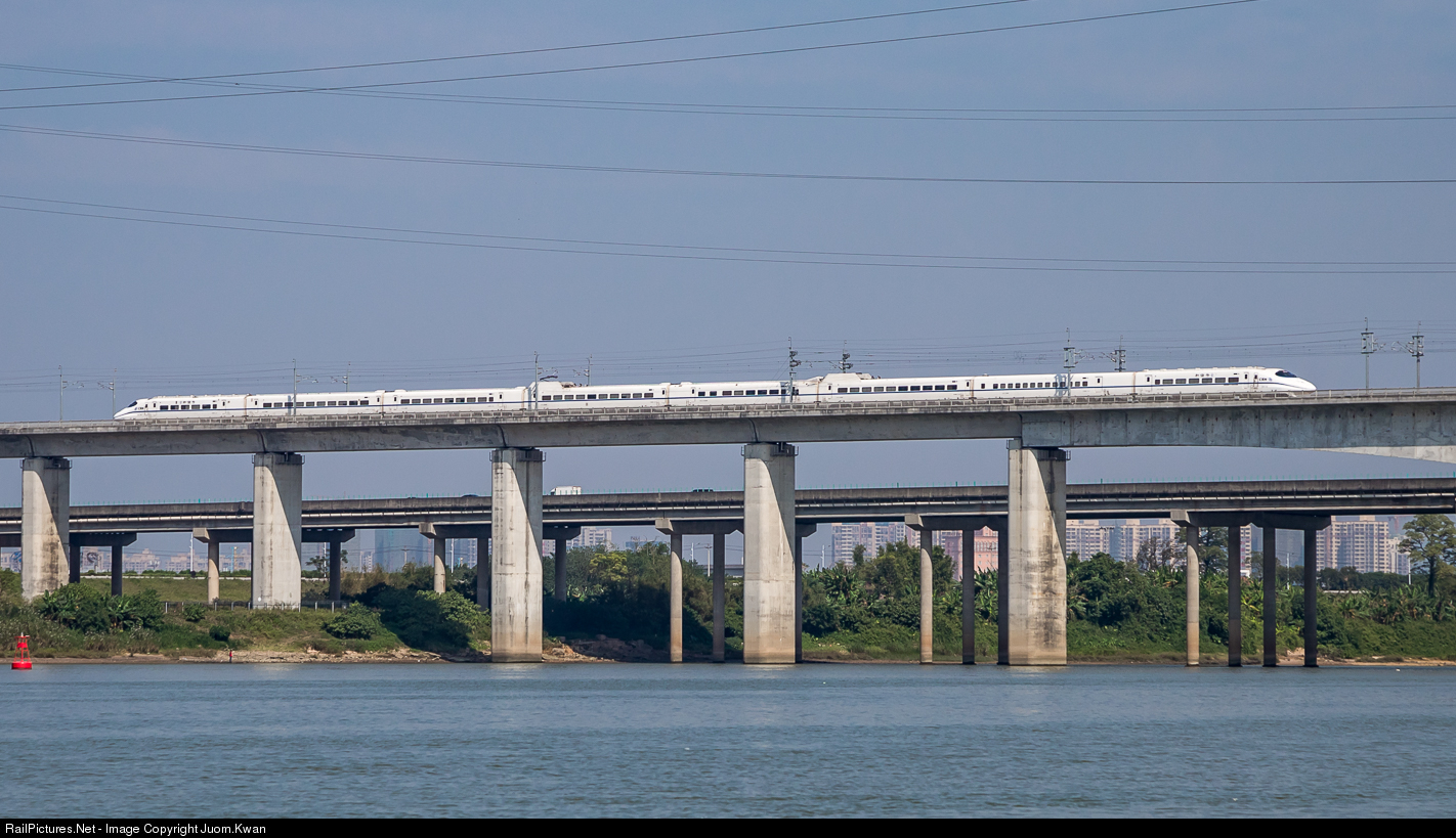 | The CRH2C-2068 high speed comprehensive inspection car passes through the Beijiang Bridge on the Guang-Fo-Zhao Intercity Railway. Guang Fo Zhao inter-city railway is now using EMU automatic driving technology referred to as ATO, so the CRH2C-2068 high-speed comprehensive inspection car every half a month to Guangfo Zhao inter-city railway routine inspection.CRH2C-2068 (formerly numbered CRH2-068C) is the second train in China with a speed of 300km / h and is based on the first phase of the CRH2C Electric Motor Train (EMU). The train was produced by Qingdao Sifang Locomotive and Rolling Stock Co., Ltd., and was launched in January 2009. |