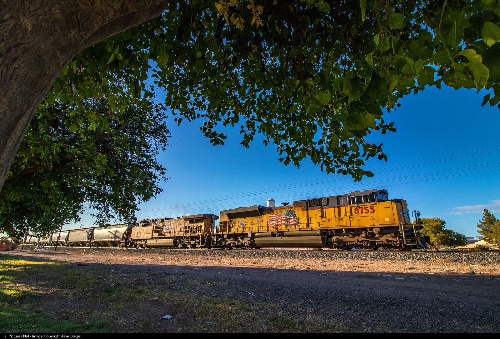 | What’s a 4th of July day without a UP train led by 2 engines with the American Flag? This was a hot afternoon, but a shady tree offers a relaxing place to photograph also a nice little bit of compositionary element on a non scenic line. |