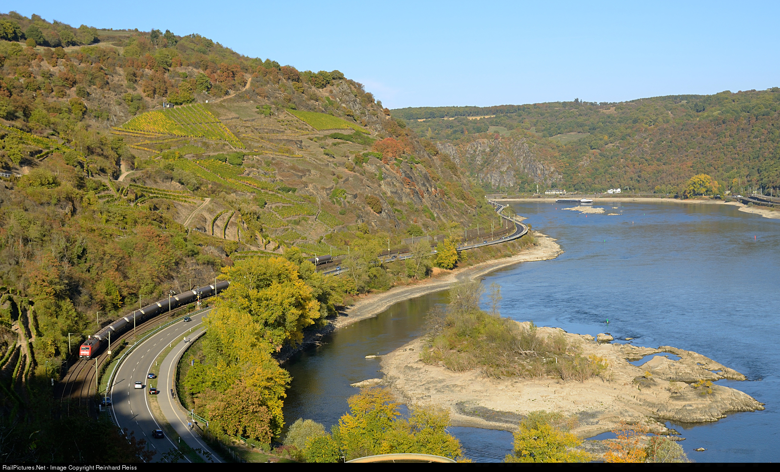 | 185 588 from HGK heads a southbound ignite train along the River Rhine. Due to missing rain in 2018 the stage of the river is the lowest since 15 years. |