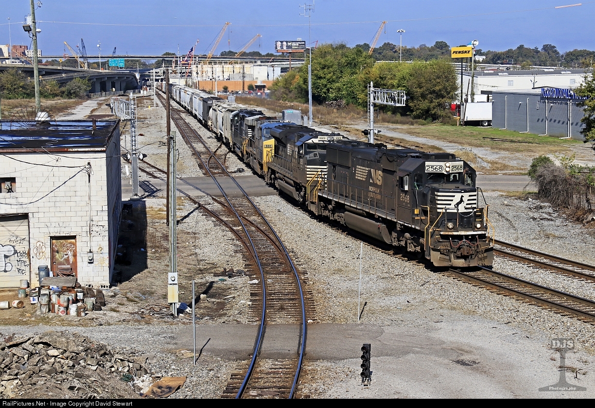 NS 320 is seen at Birmingham, Alabama on November 10, 2018 as it passes 2nd Avenue with it's SD70 leader followed by a SD70ACe, PRLX CW60AC and SD40-2. NS's fleet of 29 remaining SD70 series are the next scheduled group to enter the carrier's capital rebuild program which will turn them from DC traction to AC propulsion along with new wide cabs, the 2500s will lose their distinct EMD appearance afterwards.