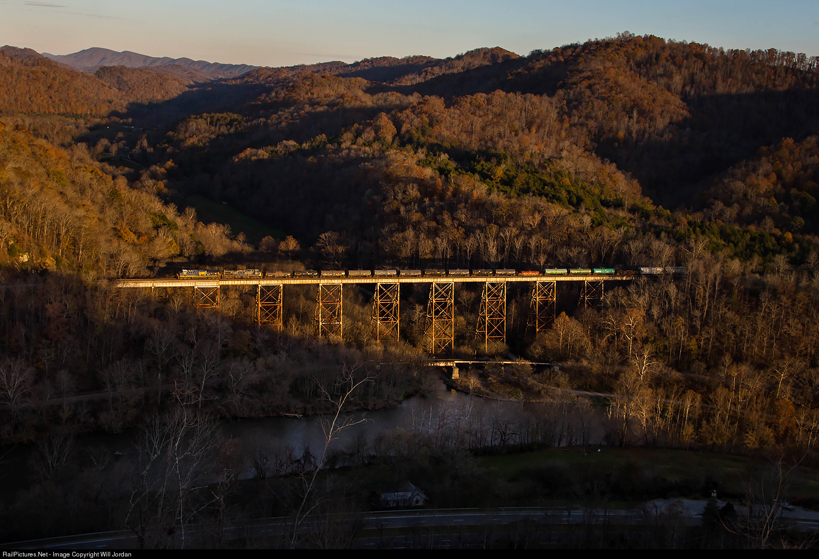 Seen from high atop an adjacent mountain, CSX Q692 works its way up the former Clinchfield Railroad, sailing high above the Clinch River on the Copper Creek Viaduct, catching the day's last light in stunning Southwest Virginia.