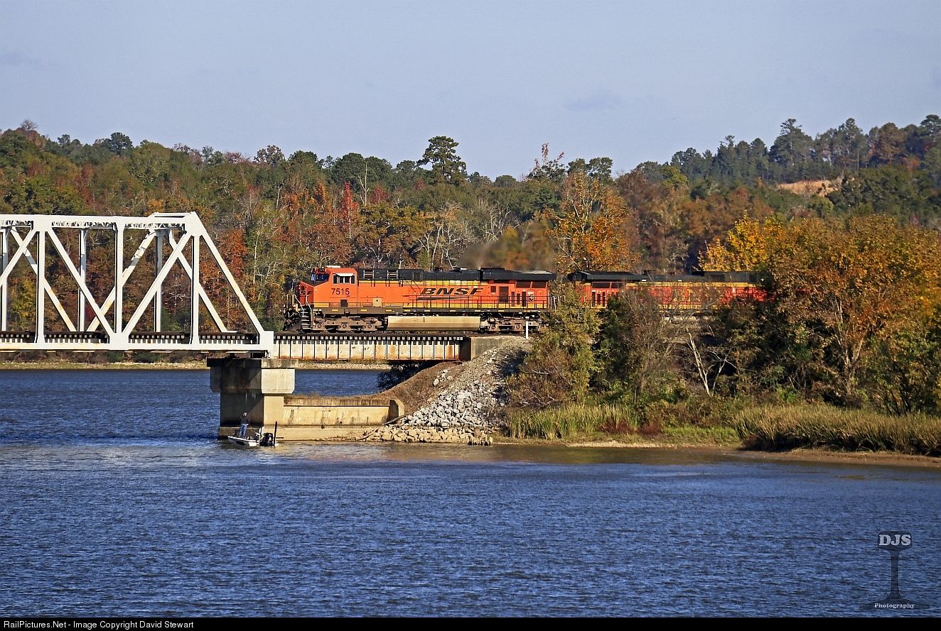 | BNSF ES44AC 7515 leads a BNSF C44-9W at Riverside, Alabama with NS 24V in tow as the train prepares to stroll across the Coosa River on November 10, 2018. |