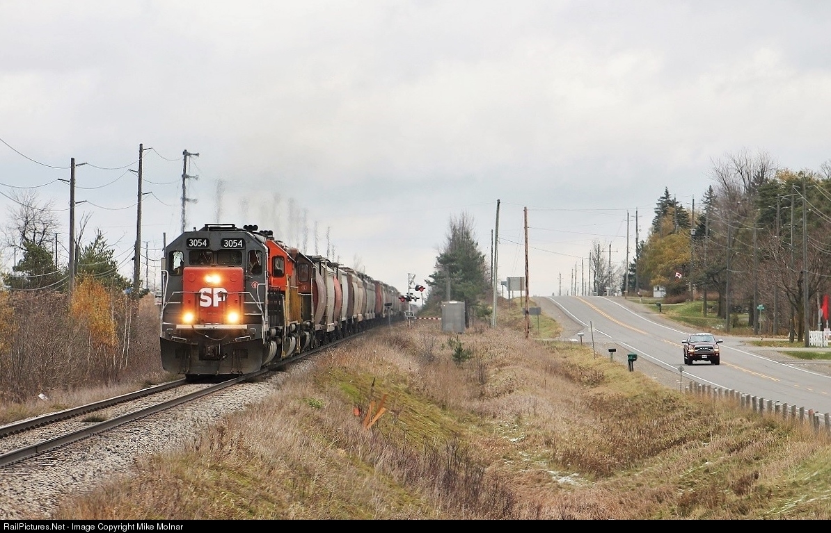GEXR 431 crests the hill at Acton, ON. as a Dodge Ram paces the train on parallel Ontario Highway 7. Some courageous artist(s) (or vandals depending what side of the spectrum you're on) painted "SP" on the nose of 3054 the night before; partially restoring/preserving the unit's previous history. With only four more days before this section of GEXR's operations are taken over by CN (as of this upload), many will be flocking to get a glimpse of an SP tunnel motor in Southern Ontario before another chapter in Ontario rail history closes.