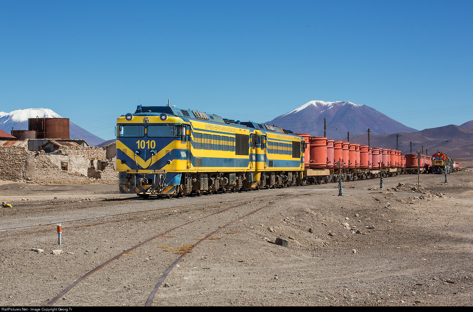 Ollagüe, 3660 meter a.s.l (12000 ft), border station between Chile and Bolivia, with a population of about 200 people. Sixaxle Bo'Bo'Bo Hitachi-Mitsubishi BFA 32M diesellocomotives # 1010 and # 1021 of the bolivian FCA (Empresa Ferroviaria Andina SA) brought a loaded train with containers from the San Cristobal mine in Bolivia some minutes before. Now they are standing in front of an empty train, which was brought from the harbour of Mejillones in northern Chile by the FCAB locomotives, standing on the right in the background.