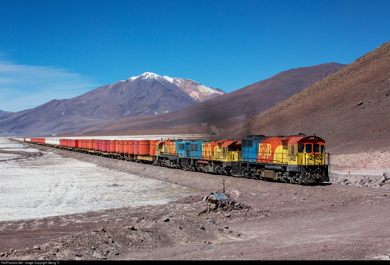 A long train with empty containers from the port of Mejiollnes to the San Cristobal mine in Bolivia is crossing a part of the Salar Ascotan on the way to the border station of Ollagüe. Locomotives are rebuilt GT22CU-3 # 2402 (rebuilt GR 12 from 1963, former Ferrocarilles Nacionales de Colombia FNC), Clyde Engineering GL26C-2 # 2010 from 1972 ex Queensland Railways and Clyde Engineering GL26C-2 # 2005 ex QNR. In the background is 5846 meter high volcano Cerro del Azufre.