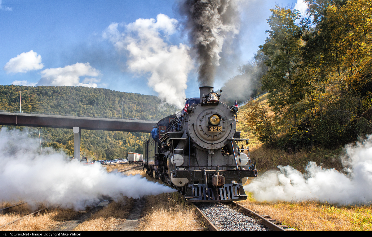 | A sprinkling of fall color on a nice afternoon can be seen in the former CNJ yard at Jim Thorpe, PA as R&N #425 heads back to the station to couple up to her train for the return trip back to Port Clinton and Reading, PA. |