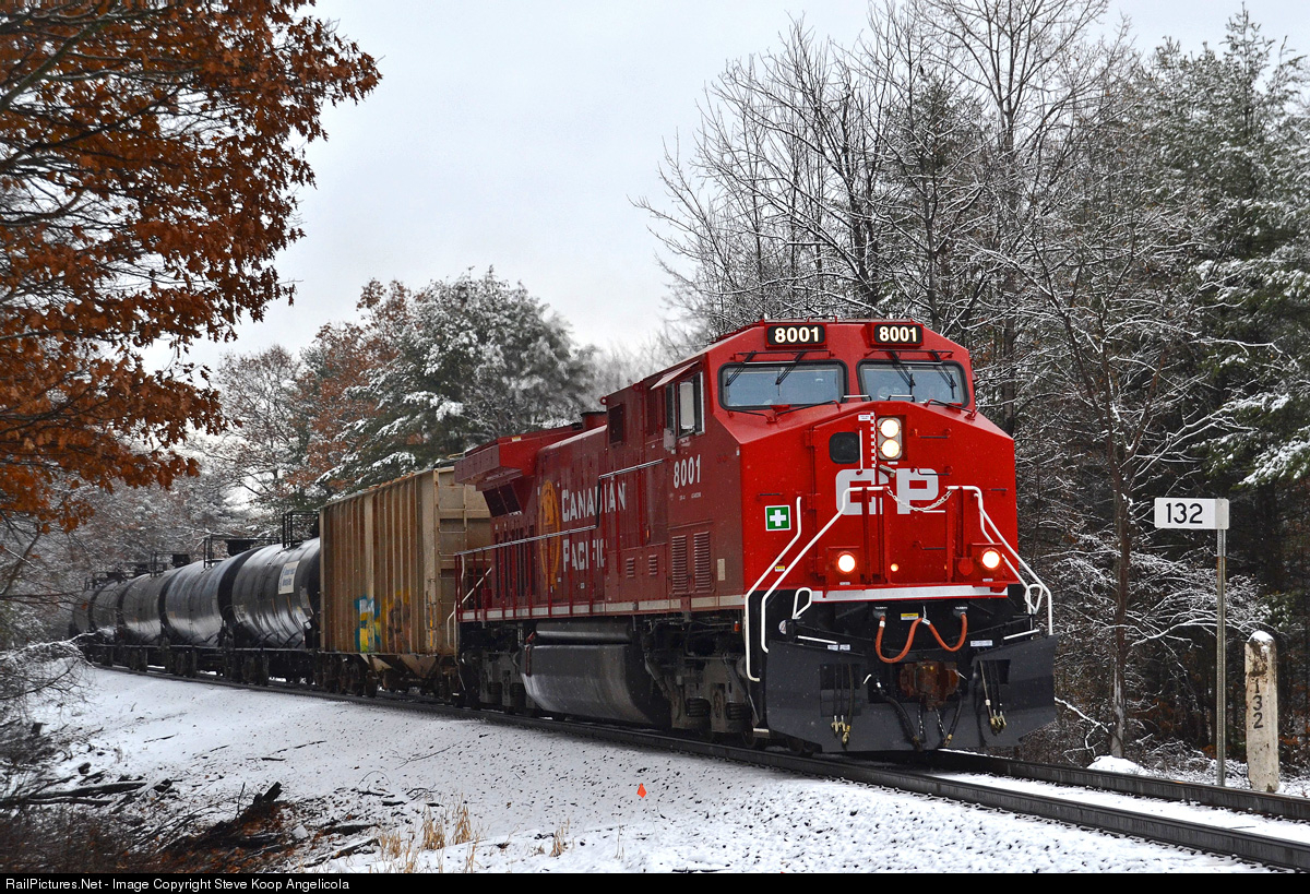 | The first measurable snowfall of the season is just tapering to flurries as loaded ethanol train CP 650 rolls past mp 132 at Wadhams, NY with a clean AC4400CWM rebuild. |