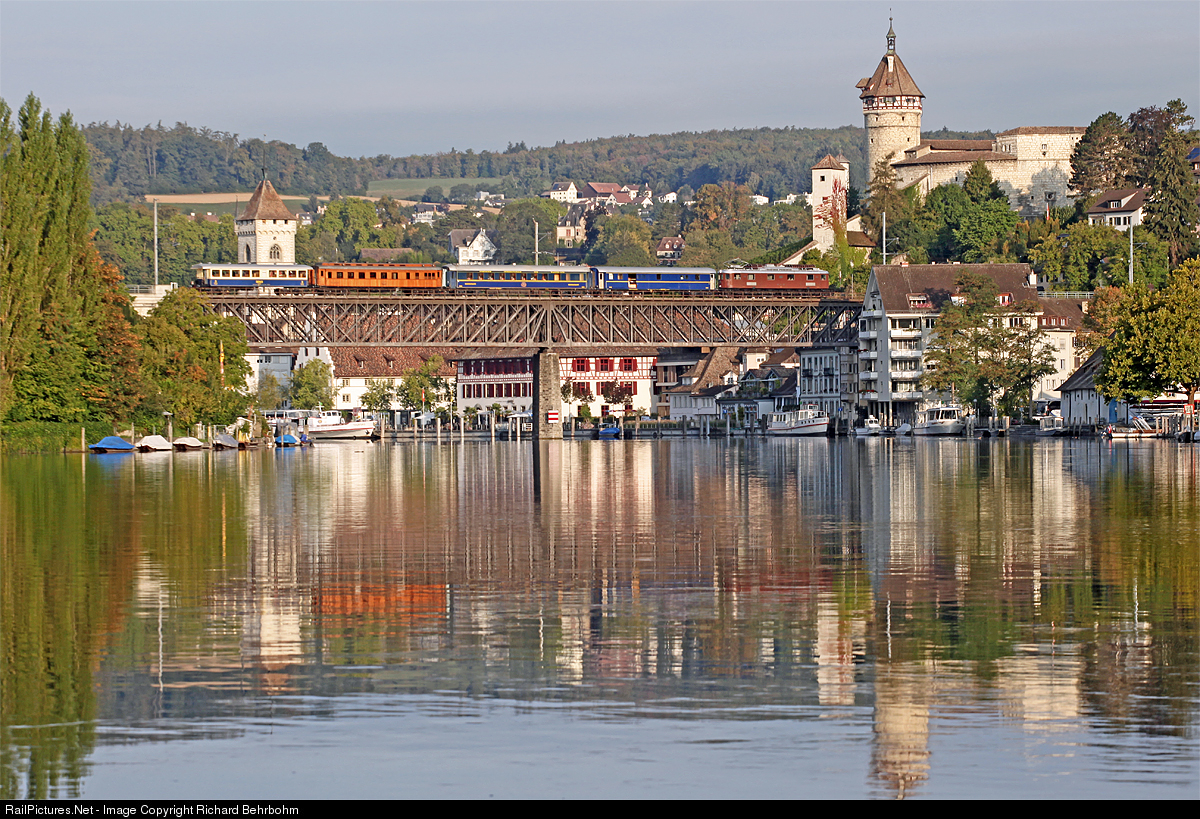| In the early morning the former BLS Ae 6/8 No. 208 (operated today by Swisstrain S.A.) is crossing with a private charter train the Rhine Bridge between Feuerthalen and Schaffhausen. The fortification Munot is the landmark of the city Schaffhausen. |