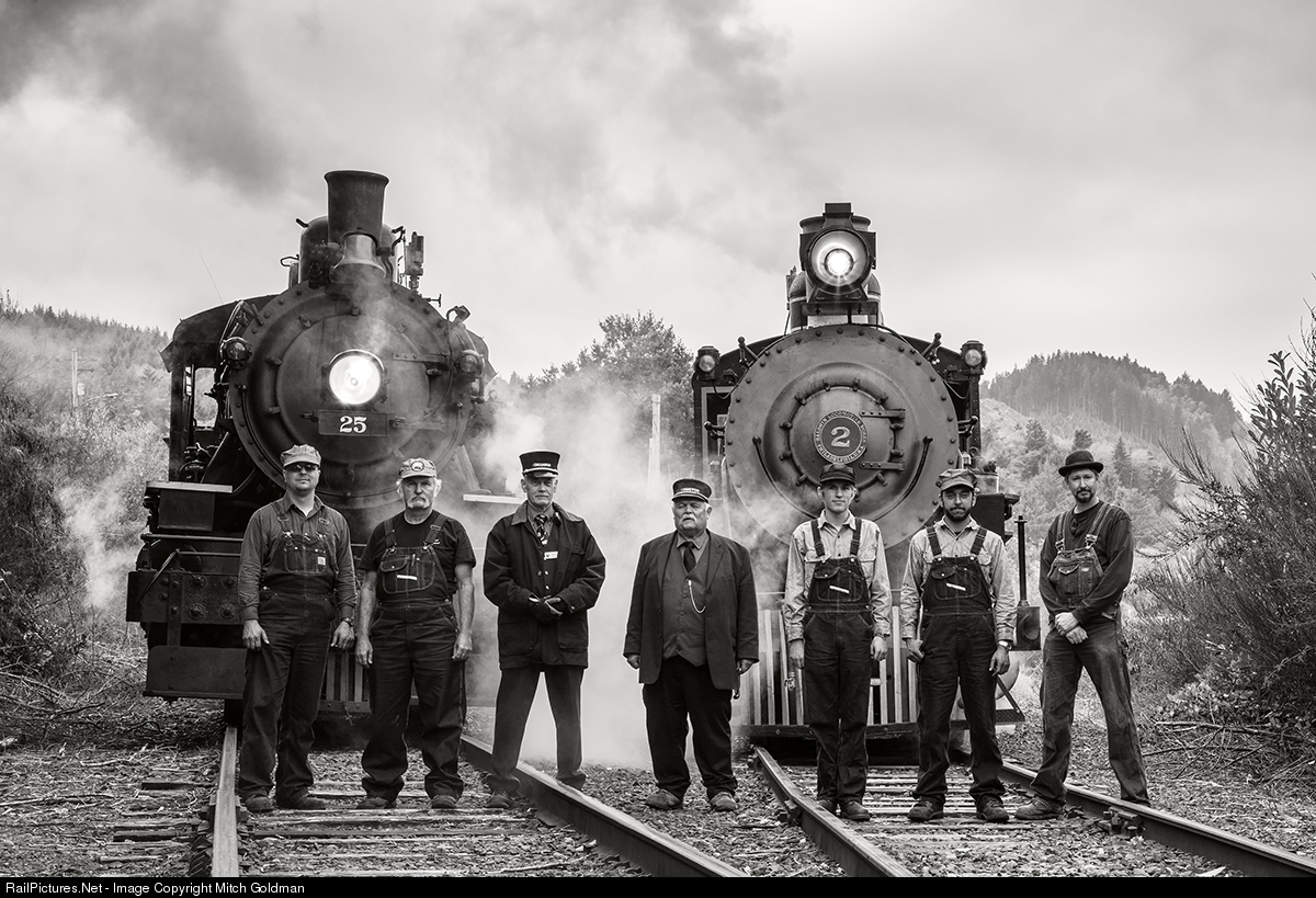 This photograph features the crews of both the McCloud River Railroad and the Polson Logging Company captured at a meet in Wheeler, OR in the early part of the century. From left to right, they are: Aaron Zorko, Fireman, Bruce Miller, Engineer, Dennis Anderson, Conductor, Mike Kirkwood, Conductor,, Steve Catt, Fireman, Tim Thompson, Engineer and Eric Hadder, Conductor.