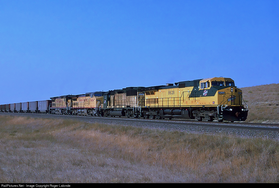| CNW C44-9W 8628, CNW GP50 5092, UP C41-8W 9407 and UP C40-8 9128 at Norco Jct., Wyoming August 20, 1994. |