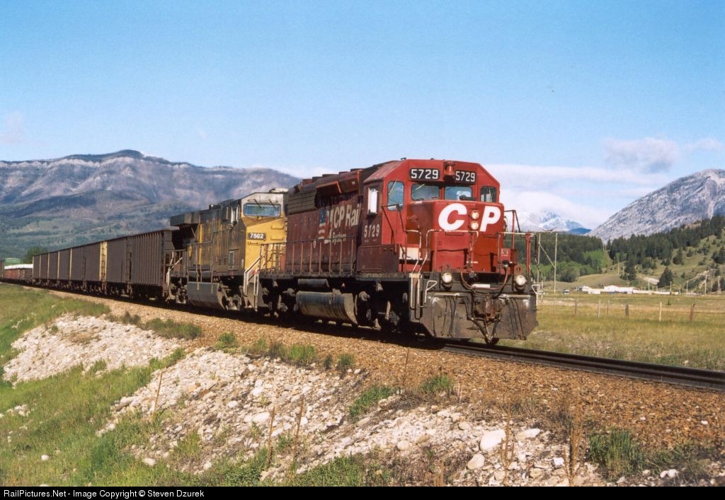CP 5729 Leading With UP 7502 Trailing, On Mixed Freight Train Heading East At Burmis AB