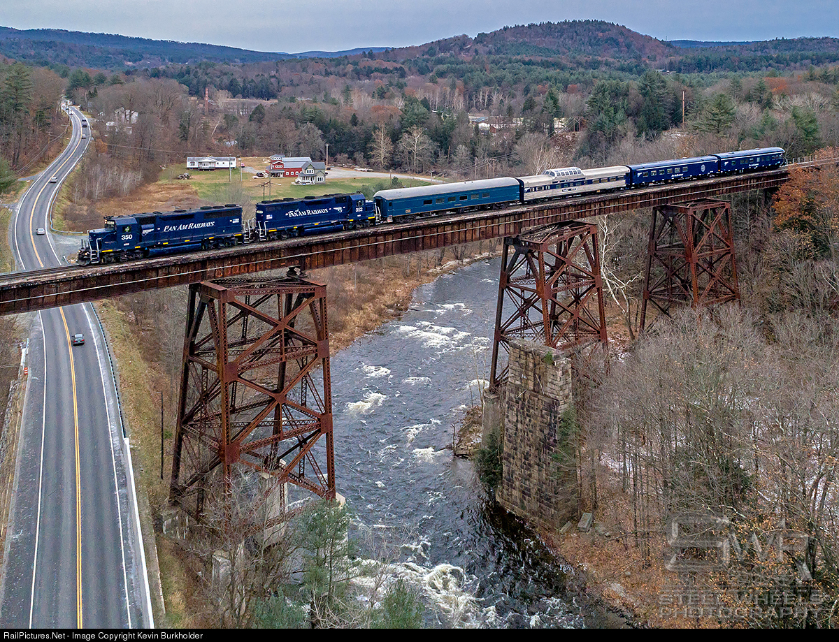 On November 15, Pan Am Railways executive staff, including President David Fink, Jr. and owner Timothy Mellon, set out for a full Connecticut River Line inspection, originating in Plainville, Connecticut and terminating in White River Junction, Vermont. The trip would traverse four separate owner's lines, including Pan Am's own from Plainville to Berlin, CT; Amtrak Springfield Line from Berlin to Springfield, MA; PAS Conn River Line from Springfield to East Northfield, MA; New England Central's Palmer and Roxbury Subdivisions from East Northfield, MA to White River Junction, VT; and Vermont Rail System's Washington County RR Lyndonville Subdivision at White River Junction. Additionally, the NECR mainline passes through a portion of New Hampshire, making the 5.5-hour trip a 4-state venture on Thursday. The train was led by MEC GP40s 350 and 352, with the FP9As getting a rest from typical duties as the Amtrak portion of the trip required cab signal and ACSES equipment that the 350/352 were operably equipped. This also marked the beginning of the new PAR 4-car OCS train era, with the recent acquisition of the CSXT 994008 "Mississippi" sleeper car, which will head to Waterville for paint following this series of trips. The train is seen crossing high above the Sugar River at Claremont, New Hampshire, on the NECR Palmer Subdivision.