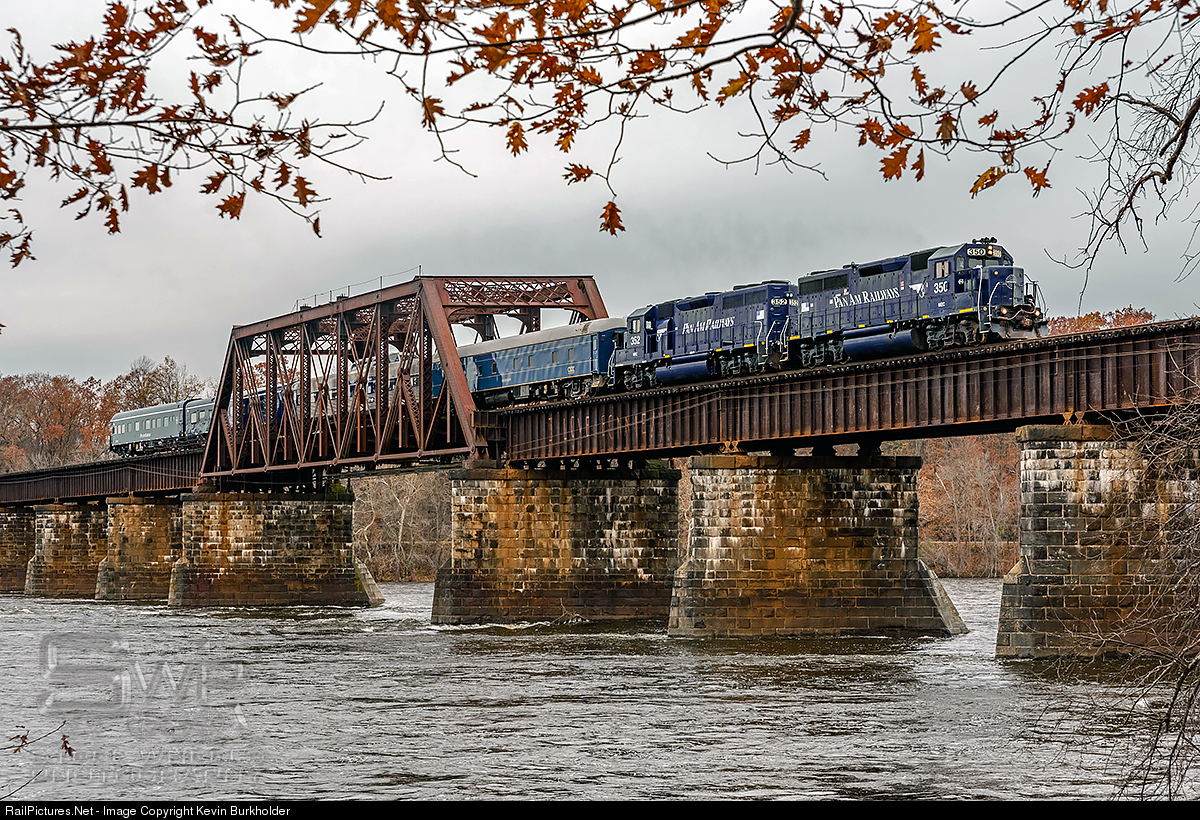 On November 15, Pan Am Railways executive staff, including President David Fink, Jr. and owner Timothy Mellon, set out for a full Connecticut River Line inspection, originating in Plainville, Connecticut and terminating in White River Junction, Vermont. The trip would traverse four separate owner's lines, including Pan Am's own from Plainville to Berlin, CT; Amtrak Springfield Line from Berlin to Springfield, MA; PAS Conn River Line from Springfield to East Northfield, MA; New England Central's Palmer and Roxbury Subdivisions from East Northfield, MA to White River Junction, VT; and Vermont Rail System's Washington County RR Lyndonville Subdivision at White River Junction. Additionally, the NECR mainline passes through a portion of New Hampshire, making the 5.5-hour trip a 4-state venture on Thursday. The train was led by MEC GP40s 350 and 352, with the FP9As getting a rest from typical duties as the Amtrak portion of the trip required cab signal and ACSES equipment that the 350/352 were operably equipped. This also marked the beginning of the new PAR 4-car OCS train era, with the recent acquisition of the CSXT 994008 "Mississippi" sleeper car, which will head to Waterville for paint following this series of trips. The train is seen making the first of several crossings of the Connecticut River from Windsor Locks to Enfield, Connecticut on Thursday morning.