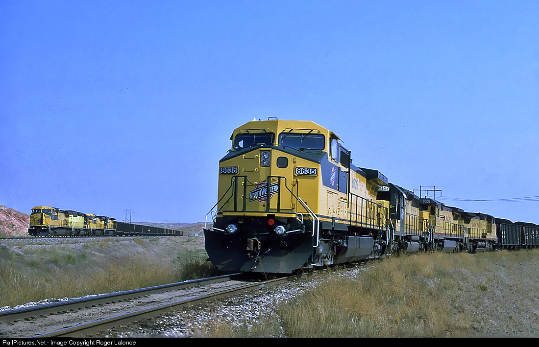 | Two Chicago & North Western coal trains at Norco Jct., Wyoming August 31, 1995. |