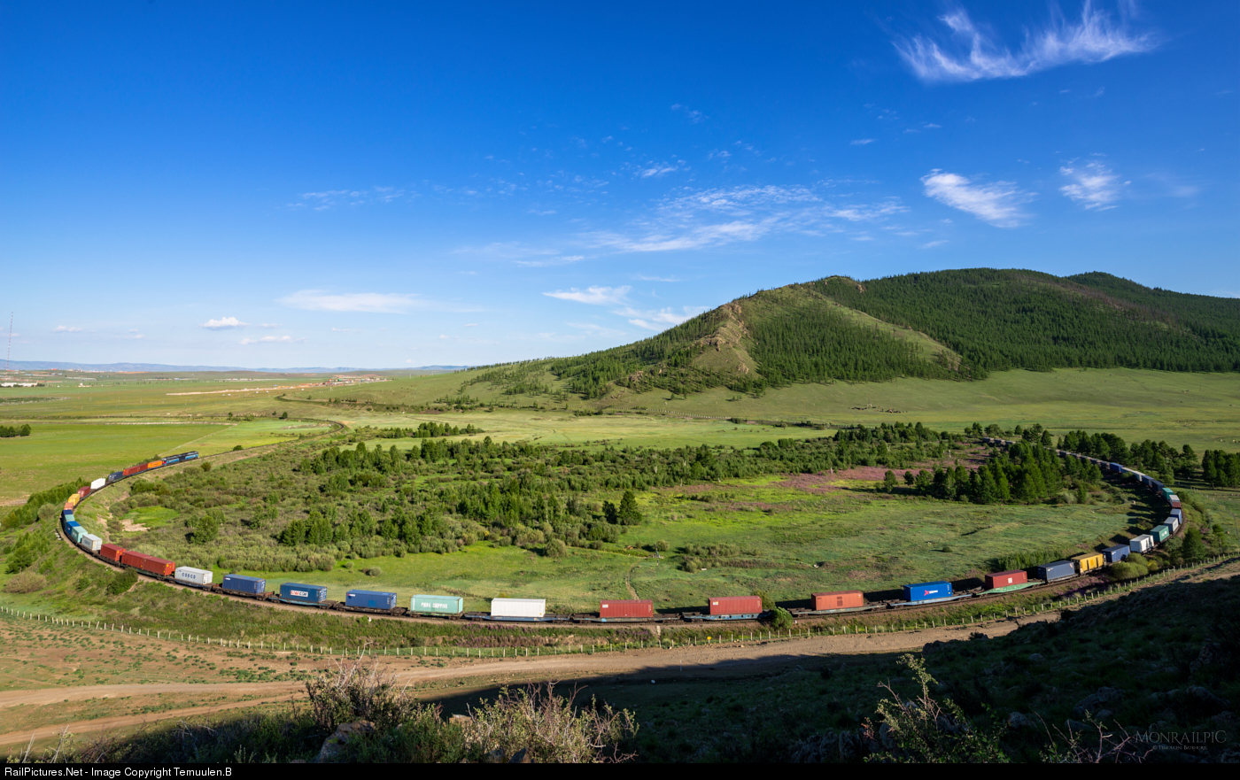 | Eurasian transit container train going on the loop of Khonkhor pass. This place is one of the famous photo locations of the Trans-Mongolian railway!