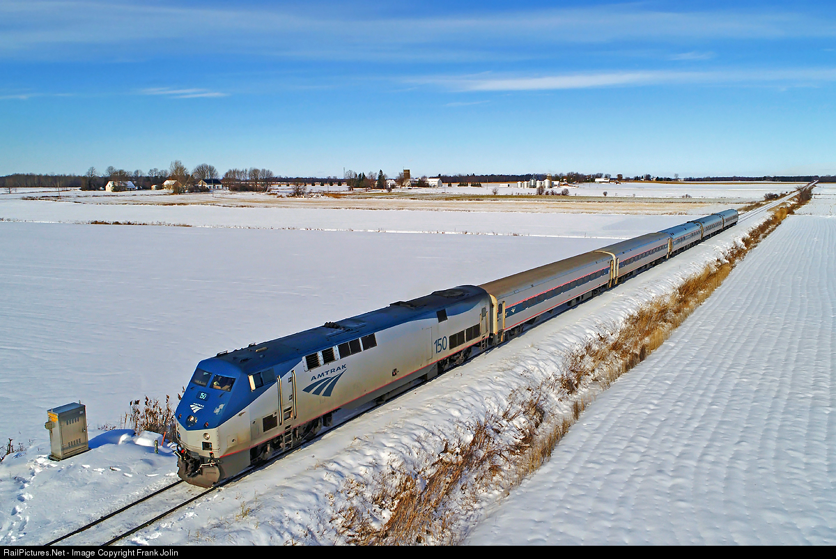 RailPictures.Net Photo: Amtrak 150 Amtrak GE P42DC at Lacolle, Quebec, Canada by Frank Jolin