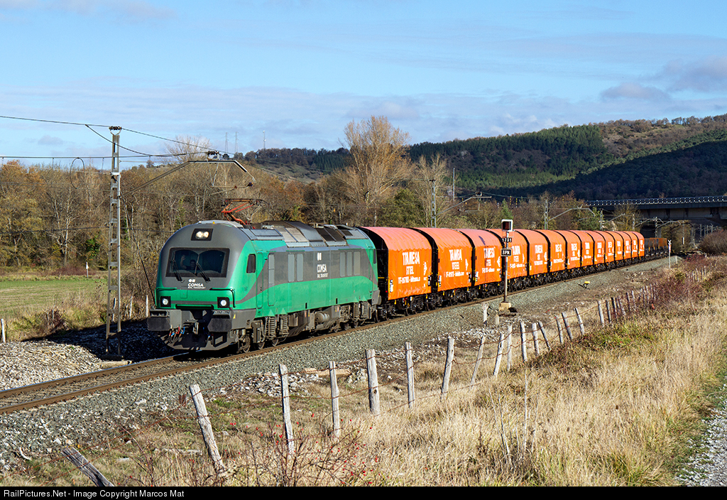 | First service of the new steel wagons of Tramesa. Hopefully we can enjoy them for some time, before the spray vandals smear them with their ravings. Steel freight Santurce-Aranda de Duero at Katadiano. |