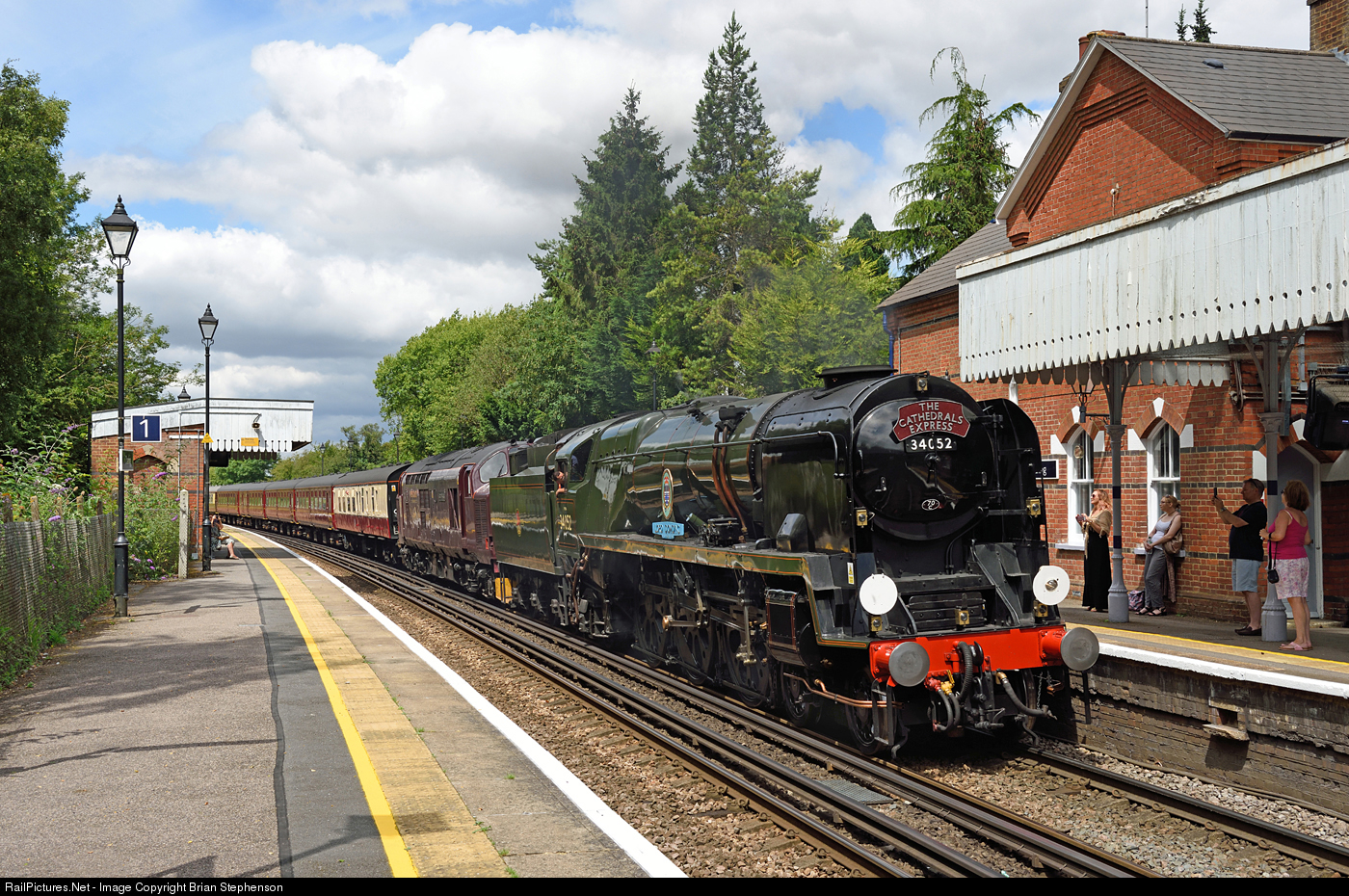 | Rebuilt Southern Railway West Country class 4-6-2 No 34046 Braunton is masquerading as Battle of Britain class Pacific No 34052 Lord Dowding (the classification was different solely according to the loco name) with a 'Cathedrals Express' from London Victoria to Canterbury West and is arriving at my local station to take water from a browser. The class 37 diesel is behind to assist due to a period of high fire risk. However the fire alarm on the diesel had been triggered due to it overheating on a very hot day and ended up being a hindrance. |