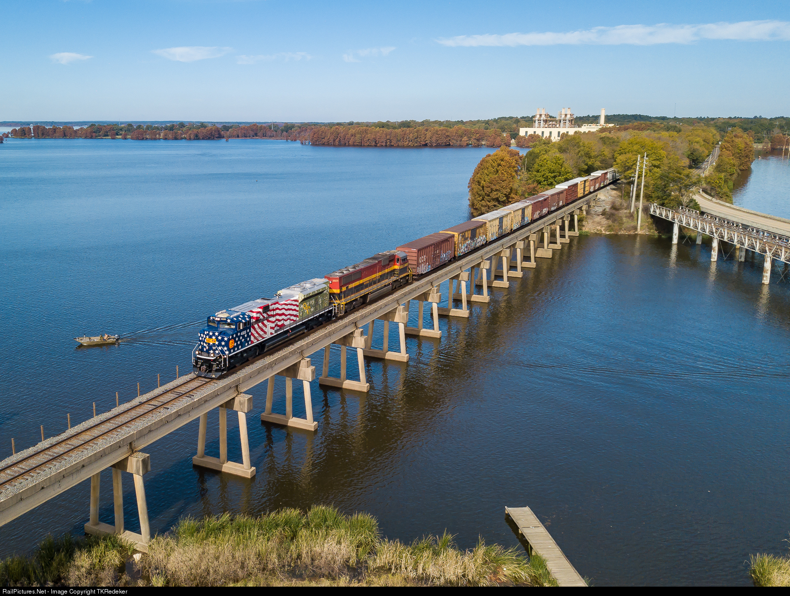 KCS Veterans Unit leads train MKCSH15 through Mooringsport, Louisiana over Caddo Lake on its first trip south after being unveiled last Monday on Veterans Day.