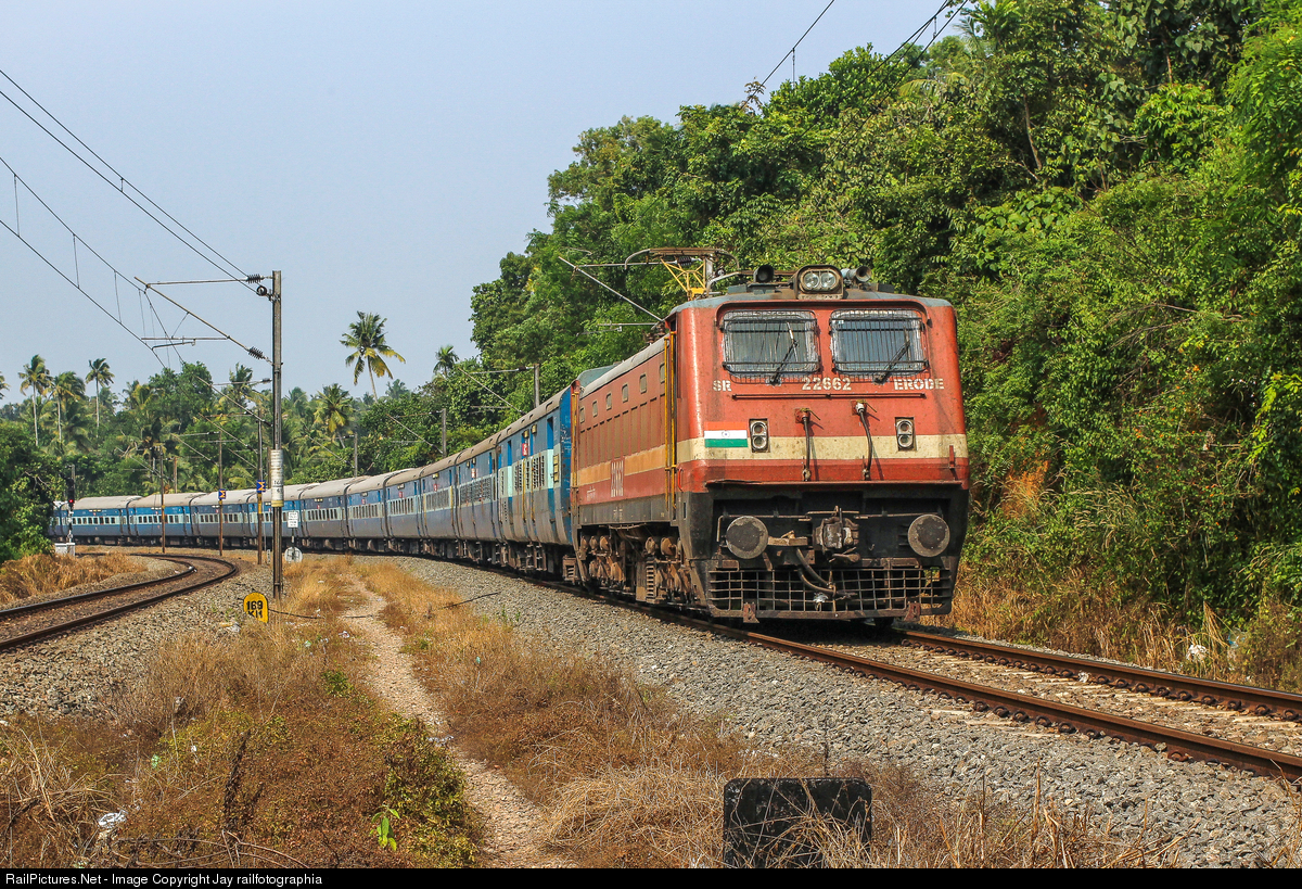 Consist of Kerala Express on sharp curve gives a twisted appearance as it negotiates on curve after another between Paravur and Kappil