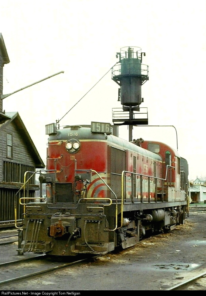 Boston & Maine RS-3 1516 in classic maroon and yellow rests beneath the sand tower at the railroad's Westboro engine terminal in West Lebanon, NH, across the river from White River Jct., VT. It had arrived in town from Boston as part of a four-unit lashup with a F7B and two other RS-3s powering train BJ-3.