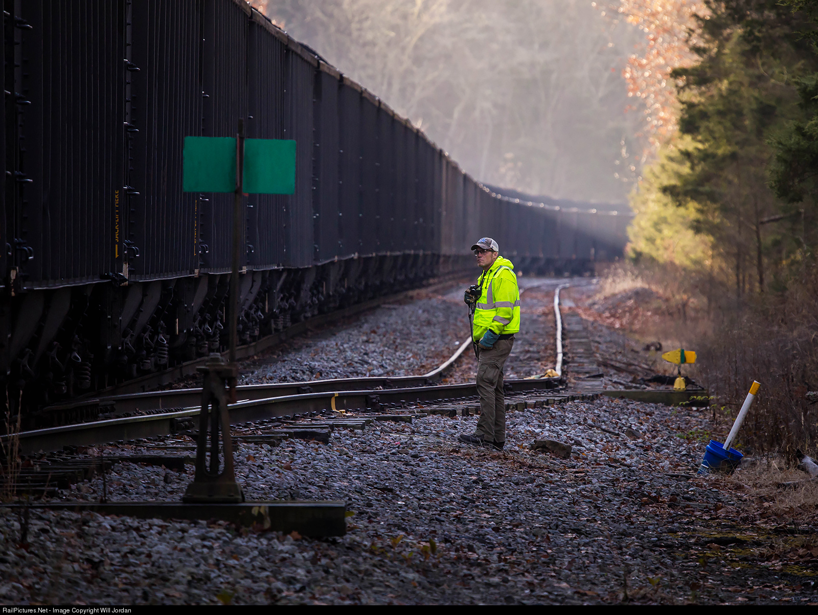 | The conductor in charge of over a hundred cars of Kentucky black diamonds guides CSX T090 over the switch at the lower end of Hagans switchback, preparing to break the train so they can navigate over the impressive switchbacks of the former L&N as the morning sun shines on the hills of rural Virginia. |